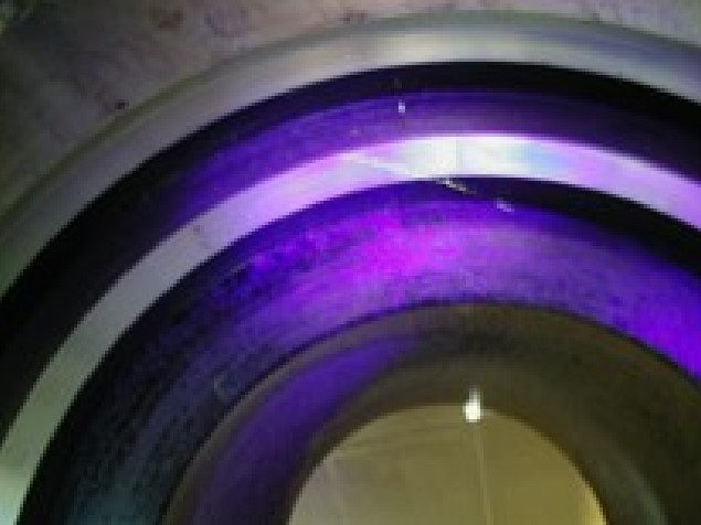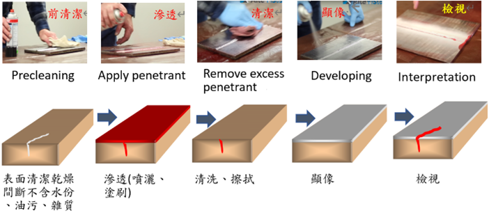Liquid penetrant testing is based upon capillary action, where low surface tension fluid penetrates clean and dry surface-breaking discontinuities. and excess surface penetrant is then removed; a developer (typically a dry powder) is then applied to the surface, to draw out the penetrant in the crack and produce a surface indication.